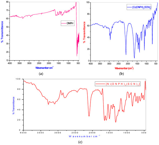 The infrared spectra analyses of ligands 2,4-dinitrophenylhydrazine and thiocyanate and their corresponding coordination compounds (Figure 2) were carried out, and the relevant peaks (cm−1) are given in Table 2.