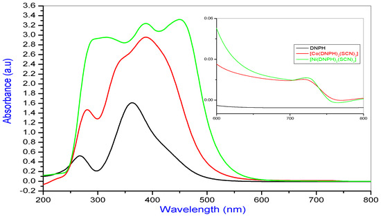 UV-visible spectrum of DNPH, along with the Co(II) and Ni(II) complexes.