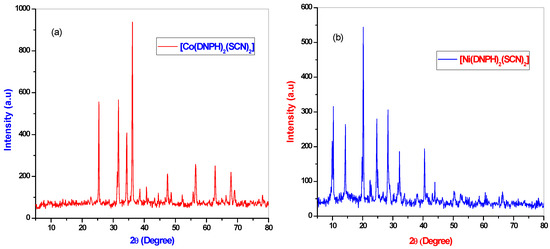 The powder X-ray diffraction analysis of the Co(II) and Ni(II) complexes are given in Figure 4. The PXRD pattern of the metal complexes was defined as sharp crystalline peaks. The PXRD pattern of the metal complex lattice parameters were calculated through the assistance of a computer program, XPERT PRO. The metal complexes gave the values of the lattice constants a = 10.82, α = 900, b = 9.24(4), β = 900, c = 6.03(2), γ = 900, V = 65.25 and the crystal system orthorhombic and Bravais-type Primitive (P) for the Co(II) complex. The Ni(II) complex lattice constants are a = 11.14, α = 90°, b = 9.59(4), β = 90°, c = 4.79(2), γ = 90°, V = 511.05 and the crystal system of orthorhombic and Bravais type Primitive (P). The crystallite sizes were calculated for the compounds of Co(II) and Ni(II) using Debye Scherrer’s Equation [25]: