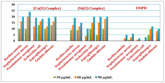 DNPH and the complexes of Co(II) and Ni(II) were treated for antimicrobial efficiency via using various species of Gram-positive and, furthermore, Gram-negative pathogenic bacteria and fungi, such as B. subtilis, E. coli, P. aeruginosa, S. aureus, A. niger and C. albicans, using the disc diffusion method. The free ligand, as well as Co(II) and Ni(II) compounds, were dissolved in DMSO. The variations (30, 60 and 90 µg/mL) of the solution were arranged individually. The prepared discs were dipped within a specified variation of free ligand, in addition to the complexes located within petri plates containing a nutrient medium sowed through every bacterial and fungal serum individually. Every plate was incubated for 24 and 48 h for the bacteria, as well as fungi, at 37 °C; furthermore, the zone of inhibition values were noted [10].