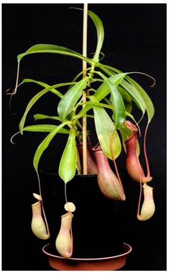 Nepenthes is a tropical plant genus occurring mainly in Southeast Asia. Plants of this genus are carnivorous. They attract, catch, and digest insect prey in order to get additional nutrients, primarily, nitrogen and phosphate [1,2]. Therefore, Nepenthes species developed a pitfall trap (Figure 1), called pitcher, where insect prey falls inside due to a slippery surface and drown in a digestive fluid [1,2]. As in many other carnivorous plants, also the genus Nepenthes harbors a large chemical diversity; currently, several secondary metabolites are isolated for pharmaceutical, biotechnological, and ethnobotanical use [3,4]. Especially, Nepenthes species are well known in traditional medicine. Multiple reports are in the literature describing curative effects of Nepenthes extracts on diseases, e.g., on hypertension, cough, fever, urinary system infections [5], malaria [6,7], pain, asthma [7], Staphylococcus infection [8], celiac disease [9], and oral cancer cells [10].