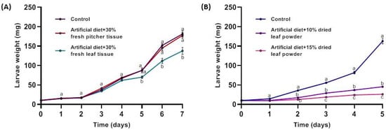 Performance of Spodoptera littoralis larvae feeding on artificial diet containing (A) fresh leaf powder of Nepenthes x ventrata leaf and pitcher (30% (w/w)) or (B) dried N. x ventrata leaf powder (10 and 15% (w/w)) Larvae were weighed every day for 7 days. Mean (± SE) labelled with different letters indicate significant difference (p < 0.05); two-way ANOVA, Šidák’s multiple comparisons test; n = 15.