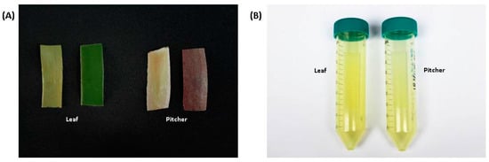 (A) Tissues of dry Nepenthes x ventrata leaf and pitcher stored for 6 months in a plastic tube. Sublimed compounds cover the dry material with a yellowish color (left) in comparison with freshly cut tissue (right). (B) Plastic tubes that stored the different tissue types for 6 months. New tubes do not show any color.
