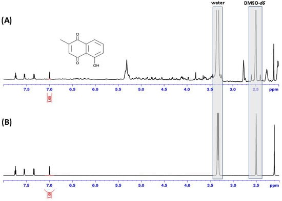 Identity of the sublimed and extracted plumbagin was confirmed by 1H-NMR spectroscopy. NMR spectra were measured on a Bruker Avance III HD spectrometer (Bruker BioSpin GmbH, Rheinstetten, Germany) equipped with a cryoplatform and a TCI 1.7 mm Micro-CryoProbe. Spectra were referenced to the residual solvent signal for DMSO-d6 at δH 2.50. Spectrometer control and data processing was accomplished using Bruker TopSpin 3.6.1, and standard pulse programs as implemented in Bruker TopSpin 3.6.1 were used.