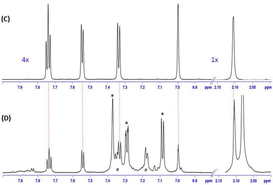 1H-NMR spectra in DMSO-d6. (A) Plumbagin (see insert) extracted from Nepenthes x ventrata leaves and (B) a plumbagin reference. (C) Details of 1H NMR spectra of a plumbagin reference and (D) the volatile exudate emitted by N. x ventrata pitcher material. Asterisks (*) indicate the presence of 4-tert-butylcatechol, a polymerization inhibitor probably extracted from the plastic material, and hashes (#) account for an unidentified impurity. The intensity of the aromatic range in (C) was increased as indicated by the factor.