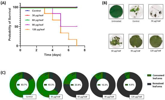 In contrast to most other bioassays that analyzed the antifeeding activity of plumbagin, here, the compound of interest was included in the food, not painted on leaves of various plant species. Nevertheless, in order to determine the mortality rate of larvae feeding on plumbagin, we also carried out an experiment using the approach with plumbagin-painted leaves. Therefore, a sweet potato cultivar (Tainong 66) that is known to be susceptible to herbivores and does not induce strong defense response upon attack was selected [44]. In first experiments, we observed that S. littoralis larvae even preferred cannibalism than feeding on those leaves. As a consequence, only individualized larvae were used. Up to a plumbagin concentration of 60 µg−1 leaf (13.3 µg cm−2, 750 µg g−1 leaf) no larvicidal effect was determined for the period analyzed (Figure 6A). With 90 µg−1 leaf (20 µg cm−2; 1.125 mg g−1 leaf) dead larvae could be found at the end of day 4 and the survival rate drop to 50% at the end of day 5. At 120 µg−1 leaf (26.7 µg cm−2; 1.5 mg g−1 leaf), dead larvae were detected at day 3 and until the end of day 7, all larvae have died (Figure 6A). For T. ni feeding on plumbagin-covered cabbage leaves, an antifeeding effect was also determined in the low microgram per square centimeter range [41]. It also can be seen that the larvae avoided feeding on the leaves covered with high concentrations of plumbagin (Figure 6B,C). With respect to the results shown in Figure 5, it seems that larval growth is heavily affected at higher plumbagin concentrations of around 700 µg plumbagin g−1 diet. However, the larvae were affected in growth but still survived at all concentrations tested (up to 900 µg g−1). The plumbagin concentrations used in the no-choice assay also showed no mortality up to 750 µg g−1 leaf tissue. Only at the used concentration of 1.125 µg g−1 leaf, we found the first larvae dying. This suggests that there might be a threshold of about 1 mg g−1 food before the S. littoralis larvae begin to die. The experiment is somehow comparable with a recent study by Hu and colleagues [42]. They investigated the mortality of Pieris rapae and Helicoverpa armigera feeding on cabbage leaves dipped into solutions with different concentrations of plumbagin and juglone, respectively. For plumbagin, IC50 values of 11 µg mL−1 (P. rapae) and 30 µg mL−1 (H. armigera) were calculated [42]. However, these data are hard to rank as it is not known how much of the compounds of interest was finally on or in the leaf disc. Nevertheless, for all the latter assays, it is difficult to discriminate whether the larvae really die either because of the ingested compounds or of hunger as they consequently avoid feeding. Other studies used topical assays where the compound was added directly onto the insect’s (e.g., S. litura, A. janata, and Musa domestica) body to investigate the toxicity of compounds [38,43]. This approach is worth to carry out but not qualified for studies on activities of compounds that are incorporated during herbivory.