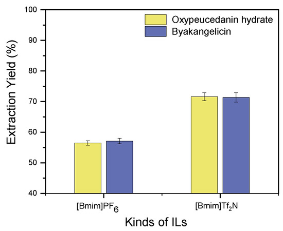Two imidazolium-based hydrophobic ILs, [Bmim]PF6 and [Bmim]Tf2N, were evaluated and compared for their ability to extract oxypeucedanin hydrate and byakangelicin from the roots of A. dahurica. These two ILs were selected in this study due to their easy availability in the market and moderate cost compared to commonly employed room temperature ILs. For the extraction experiments, powdered samples (one gram each) were extracted with IL at a 6:1 solvent/solid ratio and 40 °C extraction temperature for 120 min. The agitation speed was 500 rpm. Note that samples were soaked for 30 min prior to their extraction. The results revealed that [Bmim]Tf2N demonstrated the highest extraction performance for oxypeucedanin hydrate and byakangelicin, 71.64% (872.996 μg)) and 71.38% (1074.78 μg)), respectively. Extraction yields of oxypeucedanin hydrate and byakangelicin obtained from (Bmim)PF6 were, respectively, 56.48% (688.22 μg)) and 57.11% (859.98 μg)) (Figure 2). Based on the principle “like dissolves like”, it was assumed that target components were extracted with excellent yields in [Bmim]Tf2N because they possess similar polarity with [Bmim]Tf2N than with [Bmim]PF6. On the other hand, the difference in viscosity between [Bmim]Tf2N and [Bmim]PF6 [46,47] was assumed to have impacted the extraction abilities of these ILs. Scientists have suggested that an increase in viscosity hinders the imbibement of the solvent into the plant tissues, which therefore has a negative impact on the mass transfer of compounds [48,49]. In this regard, the closeness of [Bmim]Tf2N polarity with that of the target components and its low viscosity compared to [Bmim]PF6 were presumed as the driving forces leading to the improvement of oxypeucedanin hydrate and byakangelicin extraction yields. Because [Bmim]Tf2N showed the highest extraction efficiency for both target components, it was selected for further experiments.