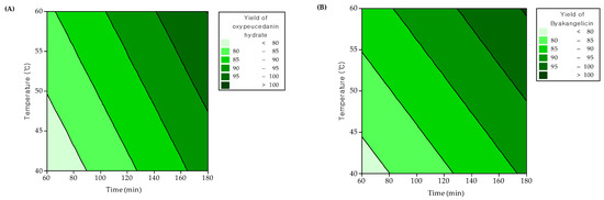 In Figure 6, the response surface plots indicating the interaction between parameters and their effects on the extraction of oxypeucedanin hydrate and byakangelicin are displayed. The solvent/solid ratio of 8:1 at an extraction temperature of 60 °C for 180 min were the optimum conditions proposed by RSM to improve the extraction yields of oxypeucedanin hydrate and byakangelicin up to 97.98% and 98.01%, respectively.
