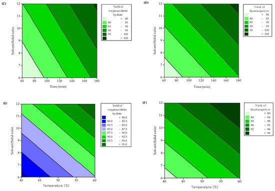 Contour plots of extraction yields of oxypeucedanin hydrate and byakangelicin versus variables. (A) effect of temperature and time on extraction yield of oxypeucedanin hydrate, (B) effect of temperature and time on extraction yield of byakangelicin, (C) effect of solvent/solid ratio and time on extraction yield of oxypeucedanin hydrate, (D) effect of solvent/solid ratio and time on extraction yield of byakangelicin, (E) effect of solvent/solid ratio and temperature on extraction yield of oxypeucedanin hydrate and (F) effect of solvent/solid ratio and temperature on extraction yield of byakangelicin.