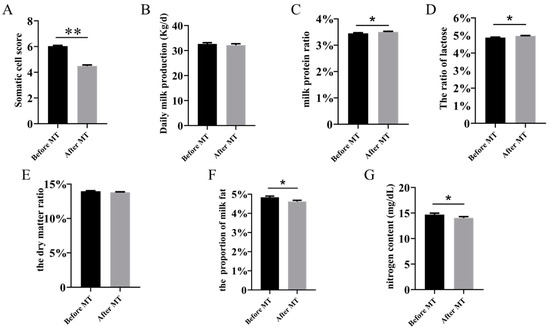 Influence of the melatonin application on the Dairy Herd Improvement (DHI). (A) Somatic cell score, (B) milk yield, (C) protein content, (D) lactose content, (E) fat content, (F) dry matter content and (G) urea nitrogen content. All data are represented by the mean ± standard error, * p < 0.05, ** p < 0.01, n = 328. MT: melatonin.