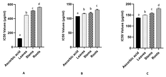 The results of the DPPH radical scavenging test (Figure 1) show that the root extract had the lowest antioxidant activity (50% inhibition concentration, IC50 value: 561.36 ± 3.93 µg/mL), with higher antioxidant properties in the leaf (449.53 ± 0.56 µg/mL) and stem (512.81 ± 1.41 µg/mL) extracts. The ascorbic acid standard had an IC50 value of 122.09 ± 0.56 µg/mL.