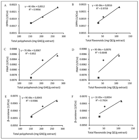 (A). Correlation between the total polyphenolic content and DPPH activity; (B). correlation between the total flavonoid content and DPPH activity; (C). correlation between the total polyphenolic content and FRAP activity; (D). correlation between the total flavonoid content and FRAP activity; (E). correlation between the total polyphenolic content and bleaching activity of β-carotene; (F). correlation between the total flavonoid content and bleaching activity of β-carotene; r: correlation coefficient and R2: determination coefficient; roots (■), stems (⬥), leaves (▴).