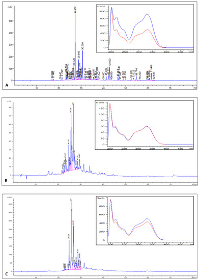 HPLC-PDA (photodiode array detector) chromatograms of the chemical profiles of polyphenols occurring in the studied extracts of leaves (A), stems (B), and roots (C). For each extract, the insert presents the PDA spectrum of the major peak and the PDA spectrum of the acteoside reference (in red).