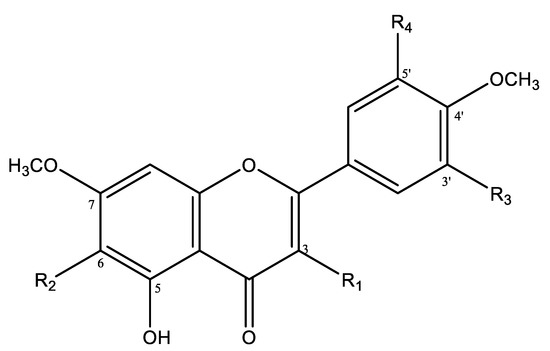 Compound 2 (5-hydroxy-6,7,3′,4′,5′-pentamethoxyflavone) has been previously reported in extracts obtained from the whole L. rhodesiensis plant. This molecule shows interesting anti-proliferative and pro-apoptotic properties [12]. Compounds 3 and 4 were already reported in various plant organs from other genera [57,59,60,61,62,63,64,65], but were observed here for the first time in L. rhodesiensis (Figure 4).
