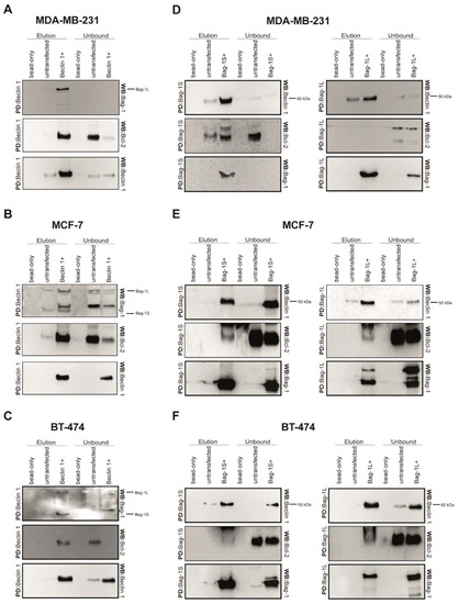 Beclin 1 interacts with both Bag-1S and Bag-1L isoforms. (A–C) His6Beclin 1 was his-pulled down by Ni-NTA beads from (A) MDA-MB-231, (B) MCF-7, and (C) BT-474 cell lysates. After wash, bound Beclin 1-related complexes were released by imidazole. As a control, precipitations were also carried out in parallel experiments with untransfected cell lysate and empty Ni-NTA beads. Elution and unbound fractions were subjected to western blot analysis using anti-Bag-1, anti-Bcl-2, anti- Beclin 1 antibodies. (D–F) Both His6Bag-1S and His6Bag-1L were his-pulled down in (D) MDA-MB-231, (E) MCF-7 and (F) BT-474 cells as reciprocal experiments and analyzed by western blotting. Bag-1 and Beclin 1 were co-precipitated in all experiments.