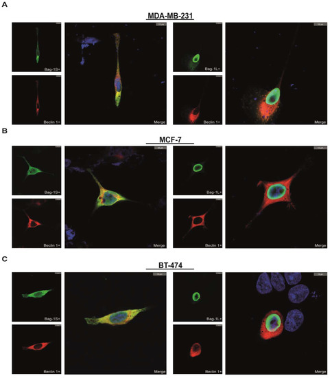 All Bag-1 isoforms have both BAG and ULD domains, however they differ based on their cellular localizations. Although His6-pull down experiments showed that Beclin 1 interacts with both small and large isoforms of Bag-1 (Figure 1), these interactions may occur artificially throughout the cell lysis or bead-binding stage of pull-down processes. To test whether these interactions are biologically relevant, subcellular localizations of Bag-1 isoforms and Beclin 1 were analyzed in situ by immunocytochemistry. His6Beclin 1 and His6Bag-1S or His6Bag-1L were co-expressed in MDA-MB-231, MCF-7, and BT-474 cells and localizations of Beclin 1 and Bag-1 were determined. Bag-1S was homogeneously dispersed in the cytosol, while Bag-1L was predominantly located at the inner side of the nucleus (Figure 2, Figure S2). Beclin 1 was also localized mostly in the cytosol, while only a very small fraction was detected in the nucleus (Figure 2). These data suggest that Bag-1L only interacts with Beclin 1 throughout the cell lysis or pull down processes due to structural similarity to Bag-1S but they do not interact endogenously as they are located in different cellular compartments. Therefore, we hypothesize that only Beclin 1/Bag-1S interaction, but not Beclin 1/Bag-1L interaction occurs endogenously and is potentially relevant for biological events including autophagy.