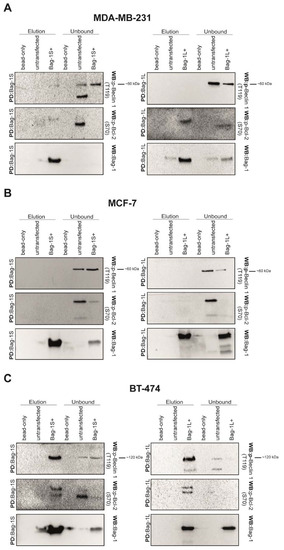 p-Beclin 1 (T119) or p-Bcl-2 (S70) do not form a complex with Bag-1 isoforms in MDA-MB-231 and MCF-7 cells. Both Bag-1S and Bag-1L isoforms were precipitated with Ni-NTA agarose beads from MDA-MB-231 (A), MCF-7 (B) and BT-474 (C) cell lysates. As a control, untransfected cell lysate and empty Ni-NTA beads were subjected to Ni-NTA precipitation in parallel experiments. Elution and unbound fractions were analyzed by western blotting using anti-Bag-1, anti-Bcl-2 (S70), anti- Beclin 1 (T119) antibodies. P-Beclin 1 (T119) was not found in Bag-1 precipitates in MDA-MB-231 and MCF-7 cells.