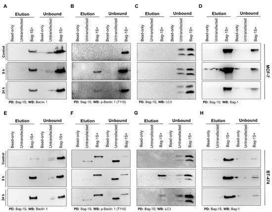Bag-1S/Beclin 1 interaction occurs independent of autophagy. Bag-1S was overexpressed in MCF-7 and BT-474 cells and cells were starved for 8 h or 24 h in serum- and glutamine-free DMEM media for autophagy induction. Normal media condition was used as non-starved control. Total cell lysate was his-pulled down by Ni-NTA beads. After wash, Bag-1S bound protein complexes were eluted by imidazole. As negative control, precipitations were also carried out in parallel experiments with untransfected cell lysate and empty Ni-NTA beads. Elution and unbound fractions of MCF-7 and BT-474 cell samples were subjected to western blot analysis using anti- Beclin 1 (A,E), anti-p-Beclin 1 (T119) (B,F), and anti-LC3 antibodies (C,G), respectively. LC3-II/I ratio of unbound fraction belonging to Bag-1S+ cells were used as a control for autophagy induction. Detection of Bag-1 through immunoblotting is performed for precipitation control (D,H). PD: Pull-down; WB: western blot.