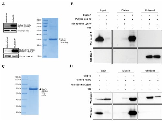 To explore whether Bag-1 binds to Beclin 1 directly, we designed an in vitro binding experiment. Firstly, we overexpressed His6Bag-1S and His6Beclin 1 in HEK293T cells which are easy to transfect and the level of protein expression is very high. Lysates from Bag-1S overexpressing cells were subjected to two-step affinity purification using Ni-NTA beads and Bag-1S was collected through flow-through mode (Figure 5A). Then, purified Bag-1S was incubated in vitro at 37 °C for 30 min with Ni-NTA-immobilized His6Beclin 1. As a negative control (Bag-1 only), we prepared a cell lysate from wild-type cells (without expressing His6Beclin 1) to eliminate false-positives resulting from non-specific interactions of the cell lysate with Ni-NTA beads. Also, we conducted a parallel experiment with His6Beclin 1 overexpressing cell lysate without incubation with Bag-1 as another control. Bag-1S and Beclin 1 did not interact with each other under these conditions and were detected in different fractions (Figure 5B). As a positive control for in vitro binding assay, we verified binding conditions through Bag-1S/Hsp70 interaction. To achieve this, purified Hsp70 (Figure 5C) was incubated in vitro with Ni-NTA-immobilized His6Bag-1S as performed for Bag-1S/Beclin 1 interaction. Upon incubation at 37 °C for 30 min, Hsp70 and Bag-1S were detected in the same fraction indicating that they do interact under the same in vitro binding conditions where Bag-1S and Beclin 1 failed to interact (Figure 5D). These experiments showed that His6Beclin 1 do not engage in a direct physical association with Bag-1S, at least under our experimental conditions (Figure 5). Since in vitro binding assay implied that there is no direct interaction between Bag-1S and Beclin 1, we speculated that the formation of a Bag-1/Beclin 1 complex might be mediated by an intermediary molecule.