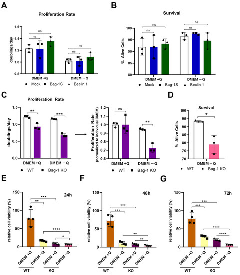 Bag-1 deficiency impairs cell proliferation and survival. (A) Proliferation rate of MCF-7 cells transfected with empty pcDNA 3.1 (Mock), Bag-1S, Beclin 1. Cells were incubated in DMEM with or without glutamine (Q) for three days, cells were counted via cell counter device, and proliferation rate was calculated as doubling/day. (B) Percent of cells from (A) that were trypan blue negative. (C) (Left) Proliferation rate of WT and Bag-1 knock-out (Bag-1 KO) cells treated in either standard DMEM or DMEM without glutamine (Q) for three days. (Right) Proliferation rates of the WT and Bag-1 KO cells in DMEM without glutamine were represented after normalization to corresponding proliferation rates in standard DMEM. Cells were counted and proliferation rates were calculated as doublings/day. (D) Percent of cells from (C) that were trypan blue negative. Wild-type and Bag-1 knock-out cells were grown in serum and glutamine containing DMEM (DMEM + Q) or serum and glutamine-free (DMEM − Q) media. MTT assay was performed upon 24 h (E), 48 h (F) or 72 h (G) starvation under specified conditions.