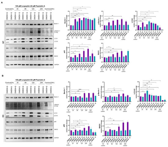 Serum and glutamine starvations were previously reported to induce autophagic process in various cell lines [46,47,48,49]. We observed that simultaneous starvations of glutamine and serum caused stronger autophagic response in MCF-7 cells compared to glutamine starvation alone (Figure S3). During autophagy process, LC3 [50] and p62 [50,51] were shown to be degraded by the autophagy machinery. For this reason, levels of LC3 and p62 are in equilibrium in the absence of autophagosomes or lysosomal protease inhibitors (Figure S4), while they accumulate in the presence of such inhibitors. To track the autophagic flux accurately, we treated cells with leupeptin and pepstatin A during starvation. These chemicals were known to inhibit acid proteases of lysosomes, thus they result in accumulation of autophagy proteins upon autophagy induction. Concentrations of inhibitors were determined based on literature [52,53]. According to our data, levels of both LC3-I and LC3-II increased markedly upon autophagy induction in both cell lines under normal media conditions. This data indicates that treatment with leupeptin and pepstatin was successful for lysosomal inhibition. LC3-II/I ratio increased significantly upon 3 h, 8 h and 12 h leupeptin and pepstatin A treatment in cells grown in DMEM + Q. On the other hand, LC3-II/I ratio increased in wild-type cells upon 8 h, 12 h or 24 h treatment in DMEM − Q (Figure 7A), while LC3-II/I ratio reached maximum at 3 h in inhibitor-treated Bag-1 knock-out cells grown in DMEM − Q (Figure 7B). In wild-type cells, p62 levels were higher in cells grown in DMEM + Q and treated for 8 h, 12 h and 24 h with inhibitors compared to 3 h control cells, while such an increase was observed in Bag-1 knock-out cells grown in DMEM + Q and treated for 12 h and 24 h (Figure 7). p62 levels were slightly increased in wild-type MCF-7 cells grown under starvation conditions for 24 h, however, p62 accumulation was observed in 8 h and 12 h inhibitor treated Bag-1 knock out cells upon starvation. Beclin 1 levels significantly increased in wild-type cells independent of starvation. On the other hand, increase in Beclin 1 levels in Bag-1 knock-out cells grown under starvation was slight. Additionally, Beclin 1 levels did not altered in Bag-1 knock-out cells grown under starvation. Wild-type MCF-7 cells resulted in increased phosphorylation level of Beclin 1 under normal conditions, while lack of Bag-1 resulted in weaker response. Besides, p-Beclin 1 levels did not altered in both wild-type and Bag-1 knock-out cells grown under starvation.