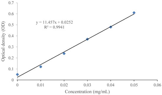 Figure 2. A linear equation (y (OD) = 11.457 × (concentration of rutin) + 0.0252) represented the data sets with R