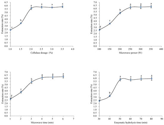 Effect of single factors on the flavonoid content in the extract. Different lowercase letters (a, b, c, d) in the same single factor express the significant differences (p < 0.05).