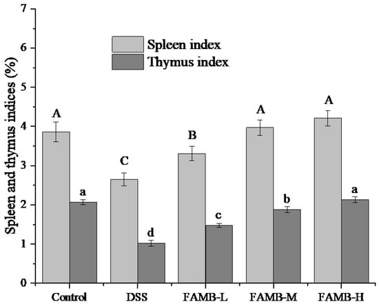 Effect of A. mume Sieb. blossom (FAMB) on spleen and thymus indices of colitis mice. Different uppercase and lowercase letters in the same index express the significant differences (p < 0.05). Uppercase (A, B, C) versus control groups for spleen index. Lowercase letters (a, b, c, d) versus control groups for thymus index.