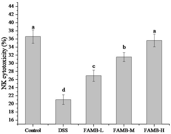 Effect of FAMB on natural killer (NK) cytotoxicity of colitis mice. Different lowercase letters (a, b, c, d) express the significant differences (p < 0.05).