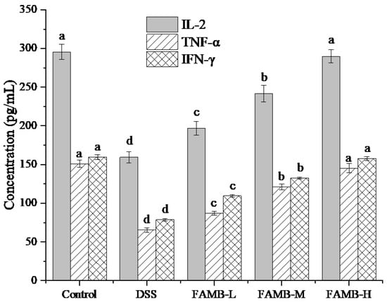 Effect of FAMB on the serum TNF-α, IFN-γ, and IL-2 concentrations of colitis mice. Different lowercase letters (a, b, c, d) in the same cytokine express the significant differences (p < 0.05).