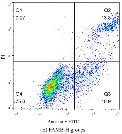−1. Mice spleen lymphocyte suspension (100 µL), produced as described above, was added into the test tube. Then, 500 µL Binding Buffer, 5 µL Annexin V-FITC, and 5 µL Propidium Iodide (PI) were added into the test tube. The test tubes were mixed gently and placed in a dark place at room temperature for 15 min. PBS buffer solution (400 µL) was added to each test tube. The apoptotic status of each group was observed, and the apoptotic yield was calculated according to the flow two-dimensional diagram.