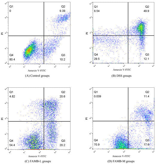 Table 4 and Figure 7 show the effects of FAMB on the apoptosis of spleen lymphocytes in colitis mice. These results showed that the apoptosis rate of spleen lymphocytes in the model group was three times as high as that in the control group. In the FAMB group, the level of apoptosis of spleen lymphocytes decreased gradually with the increase in FAMB dose. Apoptosis is a response of cells to environmental stimulus signals [32]. It is also considered to be a programmed mode of cell death [33]. Our results show that the DSS-induced apoptosis of spleen lymphocytes in colitis mice was significantly increased (p < 0.05). After the feeding the mice with FAMB, the degree of apoptosis of spleen lymphocyte decreased gradually and decreased to 24.70% in the high-dose group. These results demonstrated that FAMB could restore DSS-induced apoptosis of spleen lymphocytes in colitis mice.
