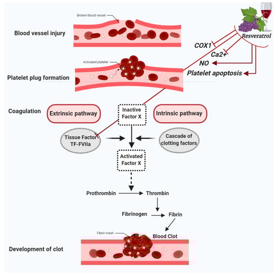 When a blood vessel is injured, three mechanisms occur in a rapid sequence to control bleeding at the injury site: (1) a brief and intense vessel wall contraction, (2) formation of the platelet plug by platelet adhesion and aggregation, and (3) coagulation, which reinforces the platelet plug with fibrin. Platelet activation and aggregation in the initial plug is also called primary hemostasis. In contrast, secondary hemostasis refers to the coagulation cascade of enzymatic reactions that ultimately lead to the conversion of fibrinogen in fibrin monomers by the action of the clotting enzyme thrombin [23]. Furthermore, secondary hemostasis is traditionally divided into two pathways: the contact activation pathway (or intrinsic pathway) and the tissue factor pathway (or extrinsic pathway). In this regard, resveratrol has been shown to exert a protective role in vascular hemostasis by acting in both primary and secondary hemostasis. Indeed, besides having anti-platelet aggregation properties, resveratrol has also been shown to modulate factors involved in the coagulation cascade [20,21,22,24] (Figure 1).