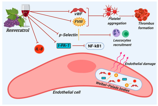 Figure summarizes the antithrombotic properties of resveratrol. Resveratrol counteracts the expression of thrombosis-associated markers such as Von Willebrand factor (vWF), factor VIII (FVIII), plasminogen activator-1 (t-PA-1), and P-selectin, which results in the inhibition of leucocytes recruitment, platelet aggregation and thrombus formation.