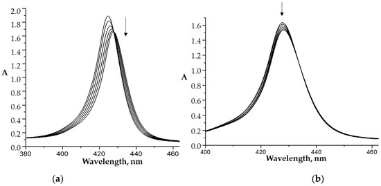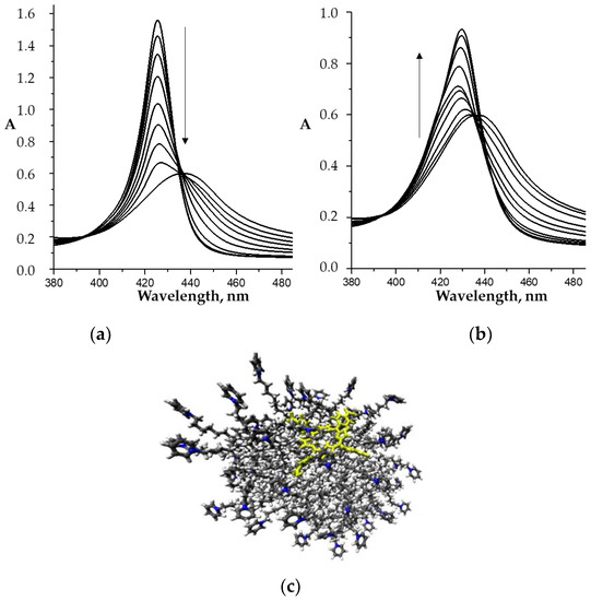 The study of the water-soluble porphyrin interactions with micelles of ionic surfactants revealed the presence of three different forms of porphyrins in solutions: the free porphyrins in the monomers form, the premicellar surfactant-porphyrin aggregates and the micellized monomer [21,41,42,43,44,45]. The formation of premicellar porphyrin aggregates occurs at low surfactant concentrations, and is accompanied by a decrease in the intensity and broadening of absorption bands in the UV–Vis spectra. The formation of a micellar monomer is observed with an increase in the surfactant concentration, and is accompanied by an increase in the intensity of absorption bands in the UV–Vis spectra.