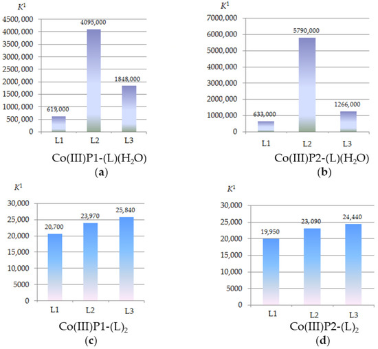 As seen from the Table 1, the energies of hydrogen bonds for the complexes Co(III)P1-(L2)(H2O), Co(III)P1-(L3)(H2O), Co(III)P2-(L2)(H2O), and Co(III)P2-(L3)(H2O) were in the range from 1.7 to 5.5 kJ/mol. Porphyrinate Co(III)P2-(OH)2 had the highest selectivity with respect to the studied imidazole derivatives upon binding of one imidazole ligand. The formation constants of Co(III)P-(L)2 bis-axial complexes according to Equation (1b) did not differ significantly from each other, i.e., no binding selectivity was observed.
