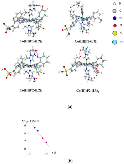Energies of Co(III)P-(L)(H2O) and Co(III)P-(L)(H2O) formation (−ΔG1 and −ΔG2, kJ × mol−1), calculated values of the Gibbs energy of the bis-axial complexes (−ΔG2, kJ × mol−1), length (r, Å), and energy (−ΔGHB, kJ × mol−1) of hydrogen bonds.