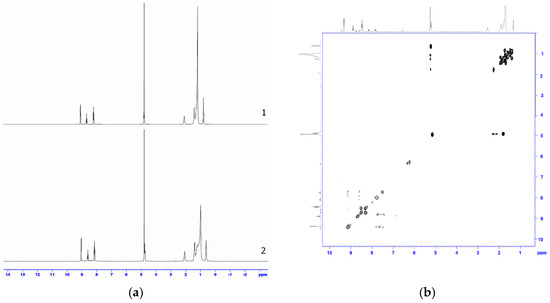 (a) 1H-NMR-spectrum of the CPC in the absence (1) and in the presence of Co(III)P1 (2) (D2O/H2O) in the region of 0.5–2.5 ppm and (b) 1H–1H two-dimensional correlation spectroscopy (2D COSY) NMR spectra of the [Co(III)P1-(H2O)2]Mc, CCPC = 6 × 10−3 M, CCo(III)P = 1 × 10−4 M.