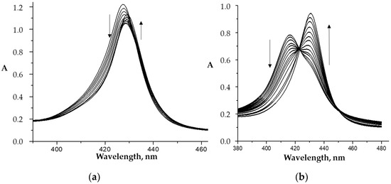 UV–Vis spectra (Soret band region) of the [Co(III)P1-(H2O)2]Mc (a) and [Co(II)P1]Mc (b) upon titration with L1 (CCPC = 0 ÷ 8 × 10–4 M, in phosphate buffer (pH 7.4) at 25 °C).