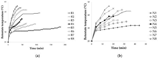 Influence of process duration (min) on retentate temperature (°C) during concentration of Cabernet Sauvignon red wine by reverse osmosis (a) and nanofiltration (b). Abbreviations: R—reverse osmosis retentate; N—nanofiltration retentate; 1–2.5 MPa with cooling; 2–3.5 MPa with cooling; 3–4.5 MPa with cooling; 4–5.5 MPa with cooling; 5–2.5 MPa without cooling; 6–3.5 MPa without cooling; 7–4.5 MPa without cooling; 8–5.5 MPa without cooling.