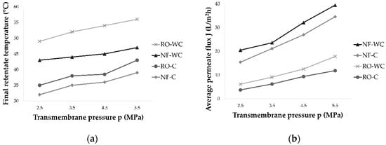 The reverse osmosis process lasted longer and resulted in higher retentate temperatures, comparing to the nanofiltration process at the same pressures. Further, the increase of working pressure increased the retentate temperature and permeate flux (Figure 2). Higher temperatures resulted in lower viscosity of the feed, that leads to higher permeate flux [,]. The highest average permeate flux during nanofiltration (39.45 L/m2h) and reverse osmosis process (17.75 L/m2h) was measured at 5.5 MPa without cooling. Decreasing the pressure and cooling the retentate resulted in lower permeate flux and longer process duration.