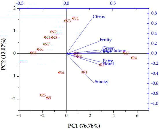 In this study, all aroma compounds identified in initial wine and retentates obtained by reverse osmosis and nanofiltration processes at different operating conditions were divided according to their main flavour note. Odour descriptions have been presented in Table 3. There were eight groups of different flavour notes: fatty, green, floral, citrus, fruity, smoky, faint and other. The last group included acetic acid (vinegar aroma), 1-butanol (fusel oil aroma), methionol (sulphurous note), ethyl 4-hydroxybutanoate (caramellic aroma) and ethyl pentadecanoate (honey aroma). For each sample, total sum of concentrations in each group was calculated and principal component analysis was made. Principal component analysis (PCA) is a multivariate statistical analysis method for representing complex and large dataset with reduced dimensionality, increased interpretability and minimized data loss []. In Figure 3, it can be observed that the principal component 1 (PC1), accounting 76.76% of total variance, separated the samples according to the operating condition used during filtration (membrane type, pressure and temperature regime). All NF retentates (except the one obtained at 5.5 MPa with cooling), RO retentates at 2.5 and 3.5 MPa without cooling and initial wine are located on the negative side of PC1. Principal component 2 (PC2; 12.07% of total variance) contributed to the separation of samples according to the dominating flavour note, from citrus to smoky. On the positive side of PC2, all NF retentate could be found. Initial wine and RO retentates are located on negative side of PC2, except for RO retentates obtained at 4.5 MPa at both temperature regimes. It can be observed that NF retentates had similar aroma profile that differed from the RO retentates and initial wine flavour composition. Slight difference can be observed in NF retentates at 4.5 and 5.5 MPa with cooling with more intense citrus note than the rest of NF retentates. Aroma profile of RO retentates depended on applied pressure and temperature. RO retentate obtained at 2.5 MPa without cooling had similar aroma profile as initial wine and they were clustered at the negative sides of both principal components. Retentates obtained by reverse osmosis at 4.5 and 5.5 MPa without cooling differed from the one obtained with cooling or at lower pressures.