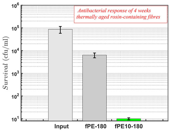 - PE fibres with a 10 w-% of rosin were mechanically durable against UV-radiation, thermal ageing at 60 °C and standard washing cycles at 70 °C as well as in terms of a strong antibacterial response against S. aureus.