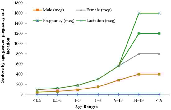 The limit between safe and toxic amounts of Se is small and has yet to be standardized in many geographical locations. The recommended dietary allowance of Se varies in humans with age, gender, pregnancy and lactation Figure 1. Pregnant or lactating women require higher 9% and 27% daily amounts of Se than other women [41]. Human beings must consume around 55 micrograms of Se per day and not exceed the maximum limit of 400 micrograms per day [42]. The World Health Organization recommends a daily average intake of 55 µg of Se, while the recommendation is varied with age, gender, diet and geographic location [43]. The International Food and Nutrition Board has recommended an average daily intake of 40–70 µg Se and 45–55 µg Se for men and women, respectively, and 25 µg Se for children [2,44]. A daily dose of 55–200 µg of Se is recommended for healthy adult humans [45,46]. Table 2 illustrates the maximum recommended daily Se intake limits, above which symptoms of Se-toxicity such as significant hair loss and abnormal nail growth appear [41].
