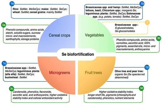 In plants, Se is most commonly found as SeMet, methyl-SeCys or ɣ-glutamyl-Se-SeCys (ɣ-Glu-MeSeCys) [93]. Supplementing wheat and maize with Se at rates of up to 100 gm Se/ha did not affect crop productivity in terms of grain or stover yield [88]. Additionally, applications of Se have been reported to increase plants’ resistance to oxidative stresses [94,95]. Further, the presence of the antioxidants glutathione peroxidase (GSH-Px) and superoxide dismutase (SOD) is enhanced with Se supplementation and, in some cases, the concentration of lipids are reduced. Hence, Se may enhance the natural defence mechanisms of plant against pests, particularly insects [96]. D’Amato et al. [97] reported that the oil yields from olive trees were enhanced in terms of intensity and stability of color following application of Se. Se biofortification in peach and pear trees increased the Se concentration in fruit and reduced fruit-softening rates, thus increasing the shelf-life of fruit products [98]. However, biofortification with high concentrations of Se negatively affected plant growth in lettuce [48] and retarded germination in mustard [98]. Some crops, such as brassicas (e.g., broccoli, B. oleracea L.) were unaffected by applications of Se [99].