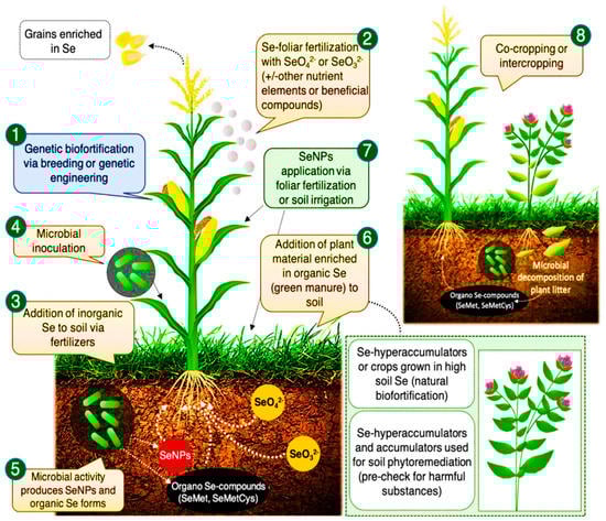 Biofortification of crops and animal feed improves the nutritional quality of food products and may help to reduce global malnutrition [88]. Plants are the most abundant sources of Se in many countries, followed by meat and seafood sources [114]. Thus, it is critical to enhancing Se uptake by plants, and ultimately the Se concentration in the human diet, to alleviate Se deficiency-induced human disorders. Se biofortification is the most effective approach to increase Se concentrations from agriculture [115].