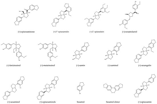 Further lignans often reported from sesame, that are are present in smaller amounts, are pinoresinol [], sesaminol [,], sesamolinol [], episesaminone [], matairesinol [], and episesamin [].