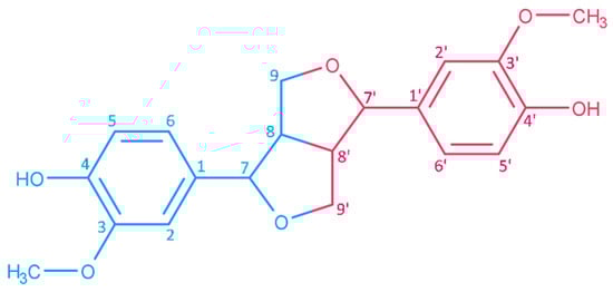 Dimerization of cinnamyl alcohol forms pinoresinol. Numbering according to IUPAC recommendation [].