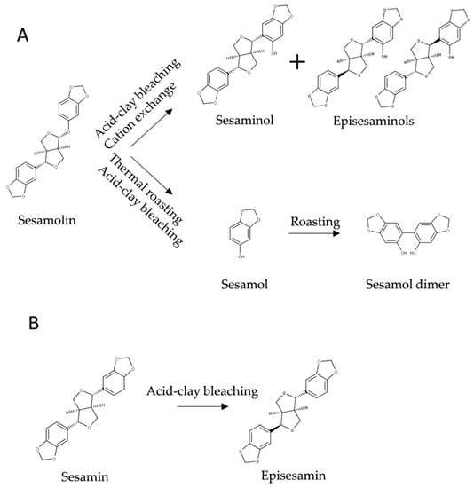 Seeds of sesame are often roasted to improve their sensory properties and sesame oil is subjected to industrial raffination, which includes alkaline saponification and bleaching with acidic clay. Several chemical transformations of lignans occur during these processes (Figure 5).