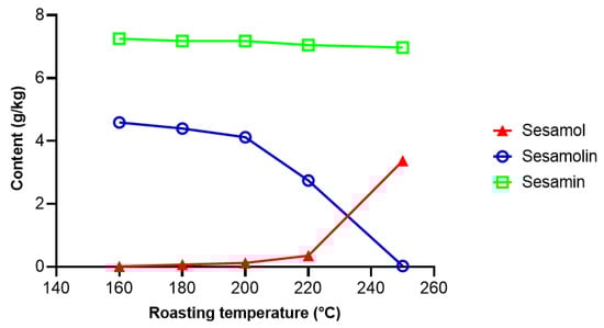 Conversion of sesamolin into sesamol by roasting. Seeds were roasted for 25 min in an electric oven at a designated temperature. The graph was constructed using data published by Yoshida and Tagaki [].